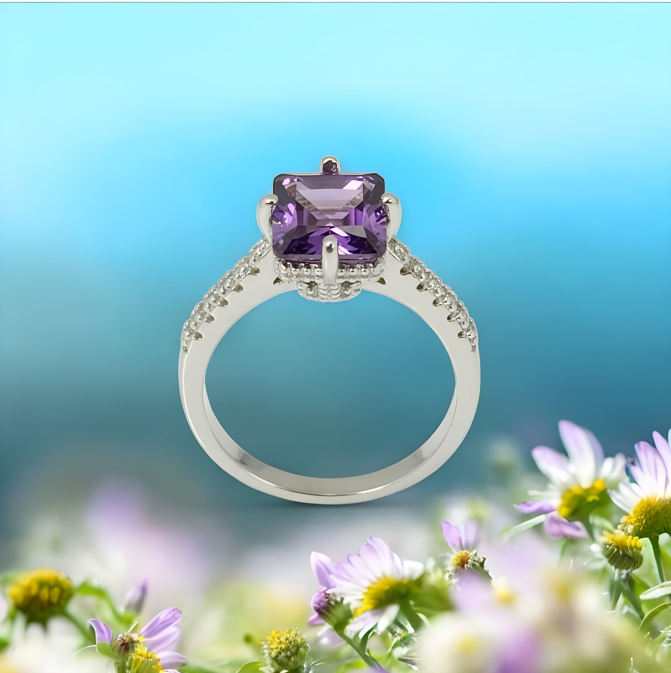 • Vivid Center Stone: Features a magnificent, rectangular-cut, violet-hued stone (Amethyst-like) that serves as a captivating focal point.