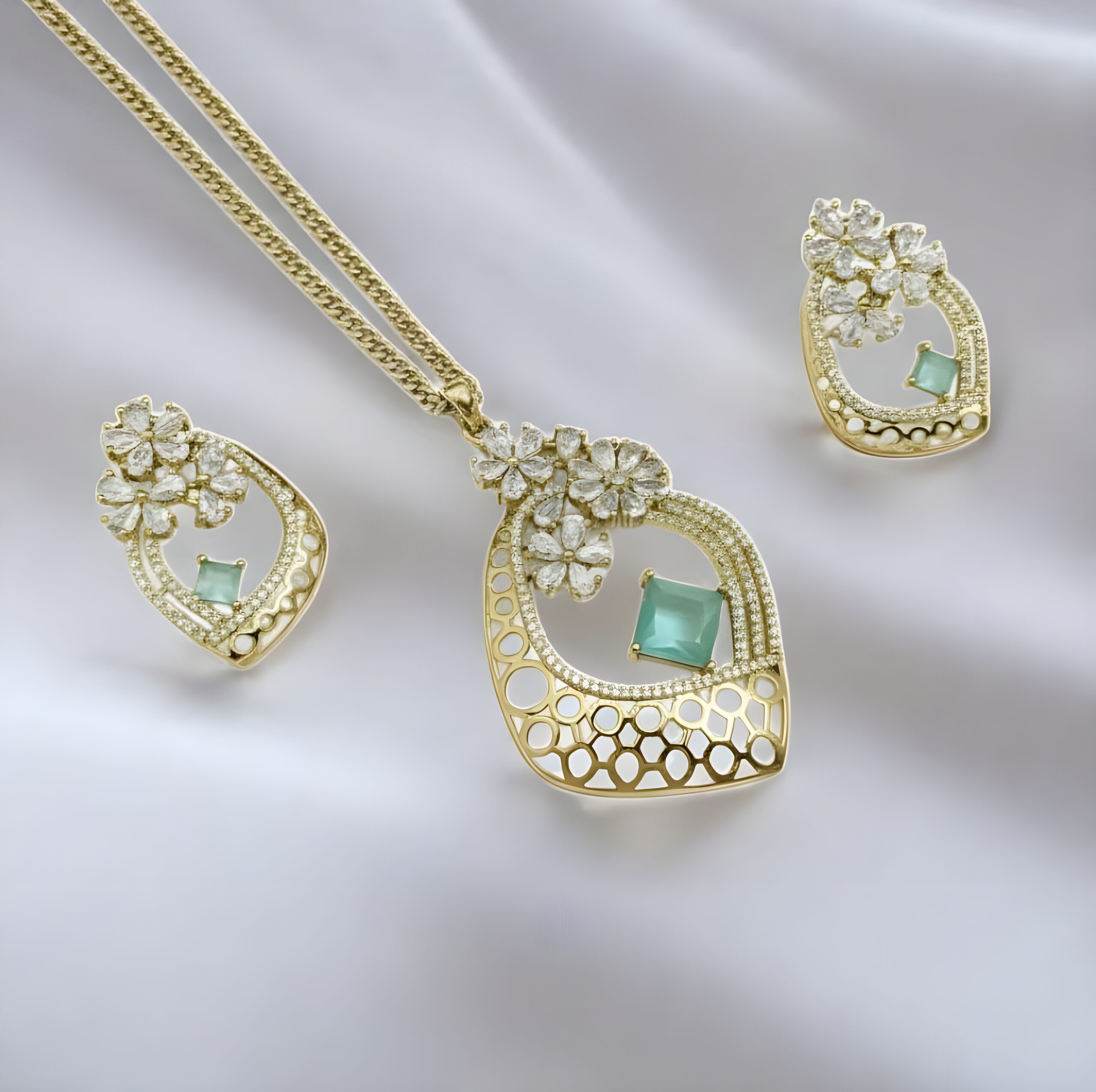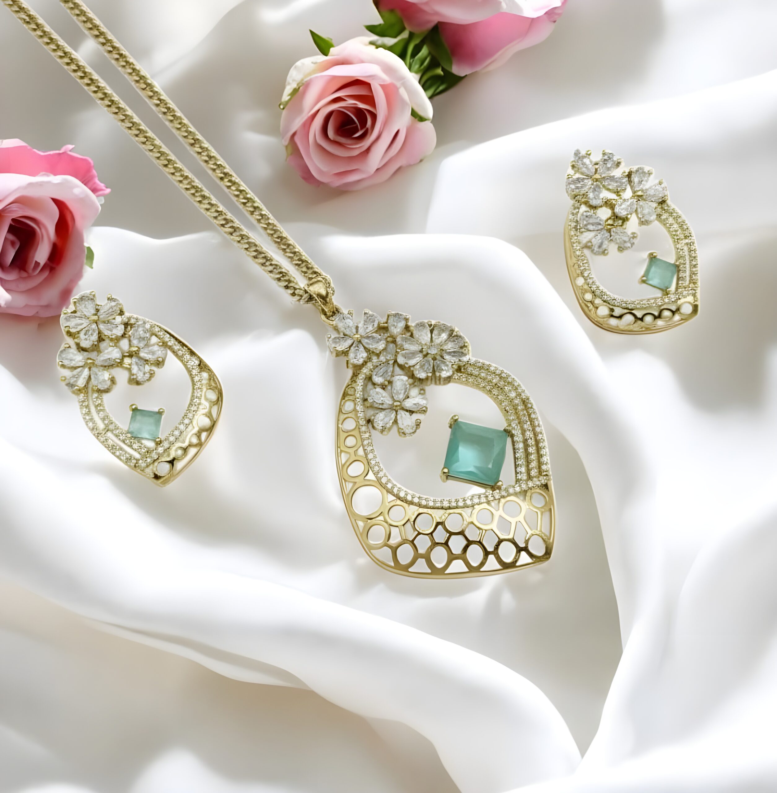 Matching Earrings: Includes a pair of perfectly coordinated earrings that mirror the pendant’s distinctive shape and floral sparkle, ensuring a cohesive look.
