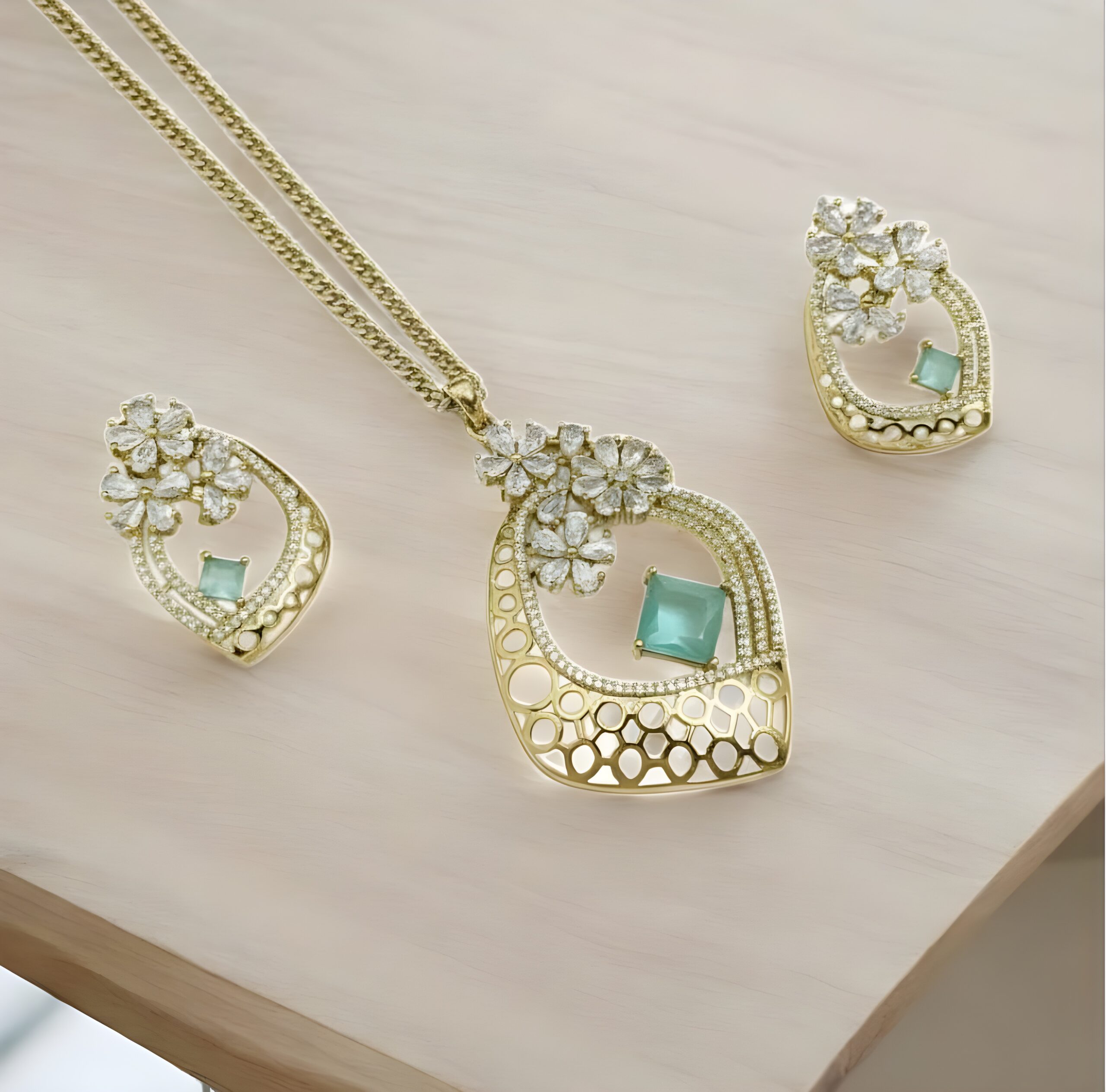 Robust Chain: The pendant is paired with a sturdy and elegant gold-toned chain that complements the set’s aesthetic.