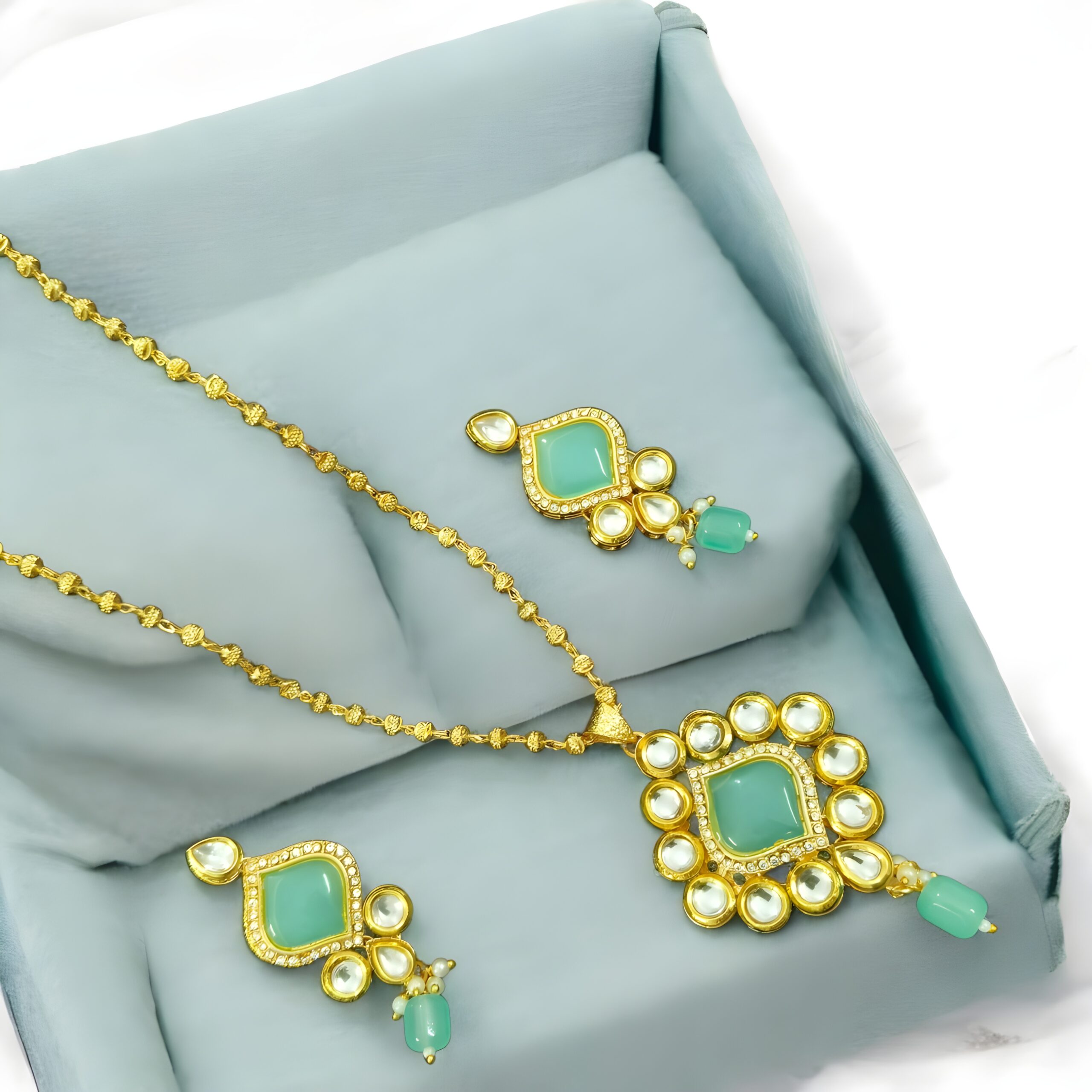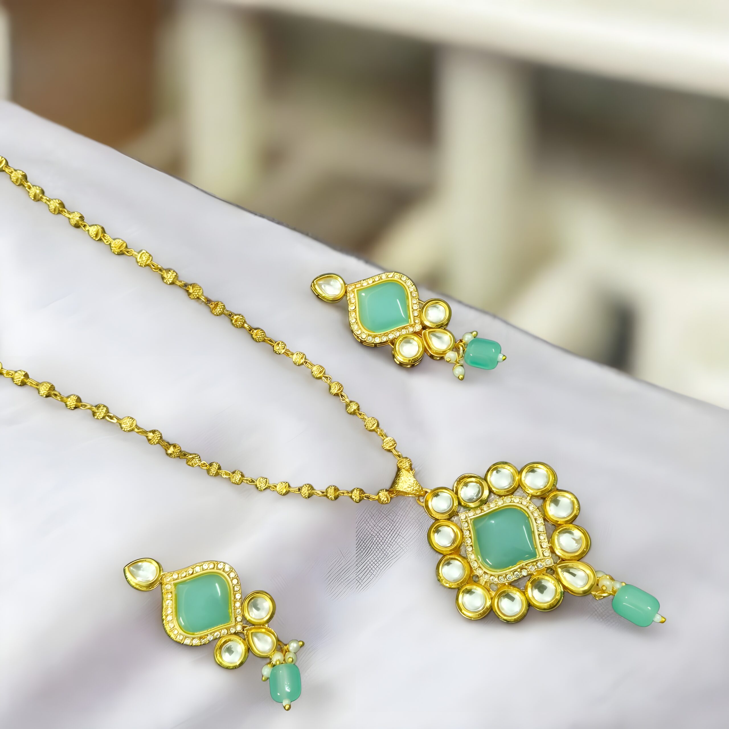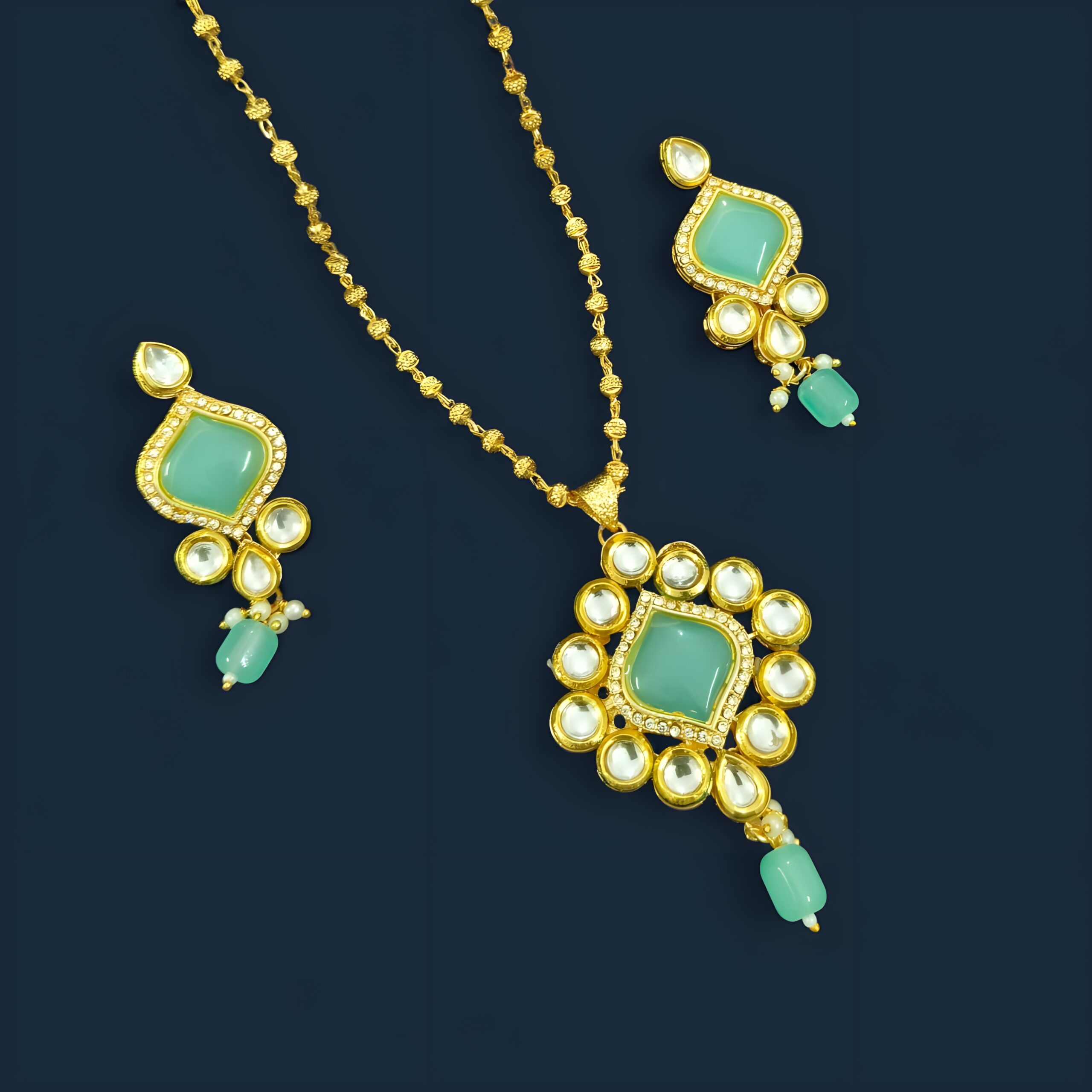 Graceful Drops Emerald bead drops on both pendant and earrings add movement and richness—perfect for festive flair.