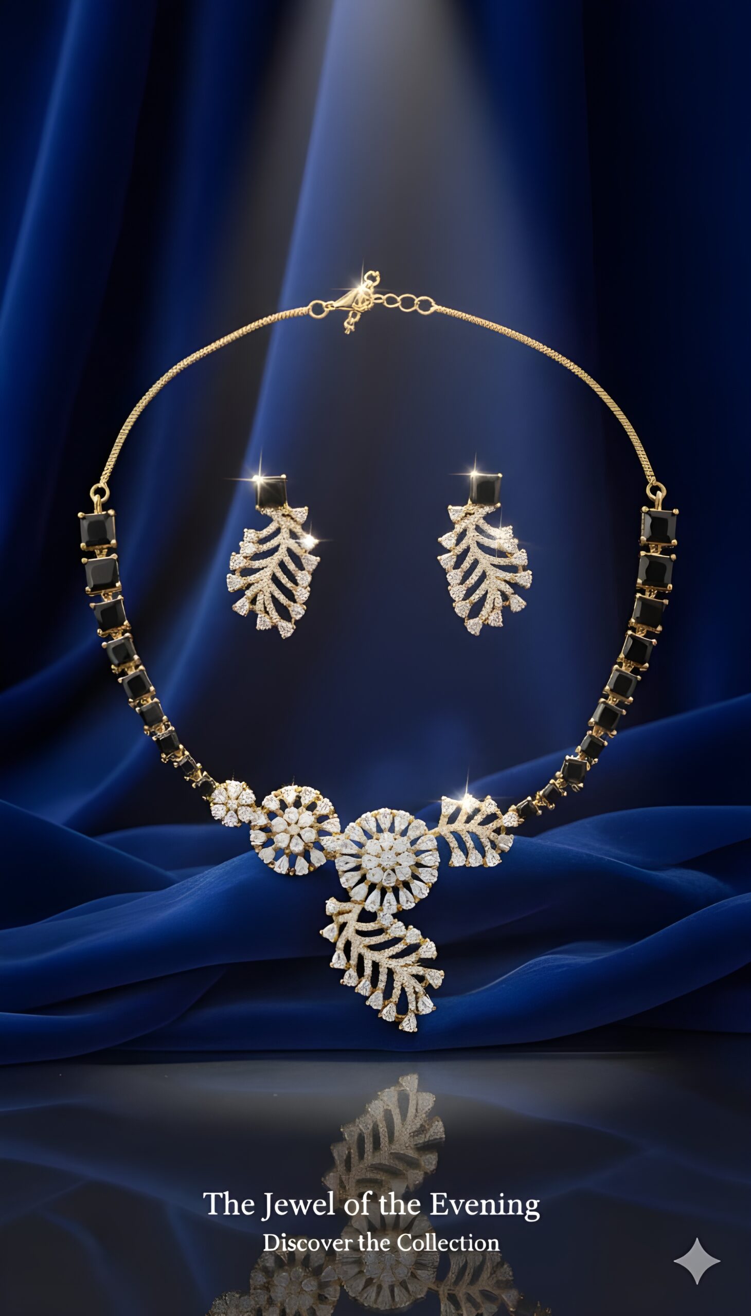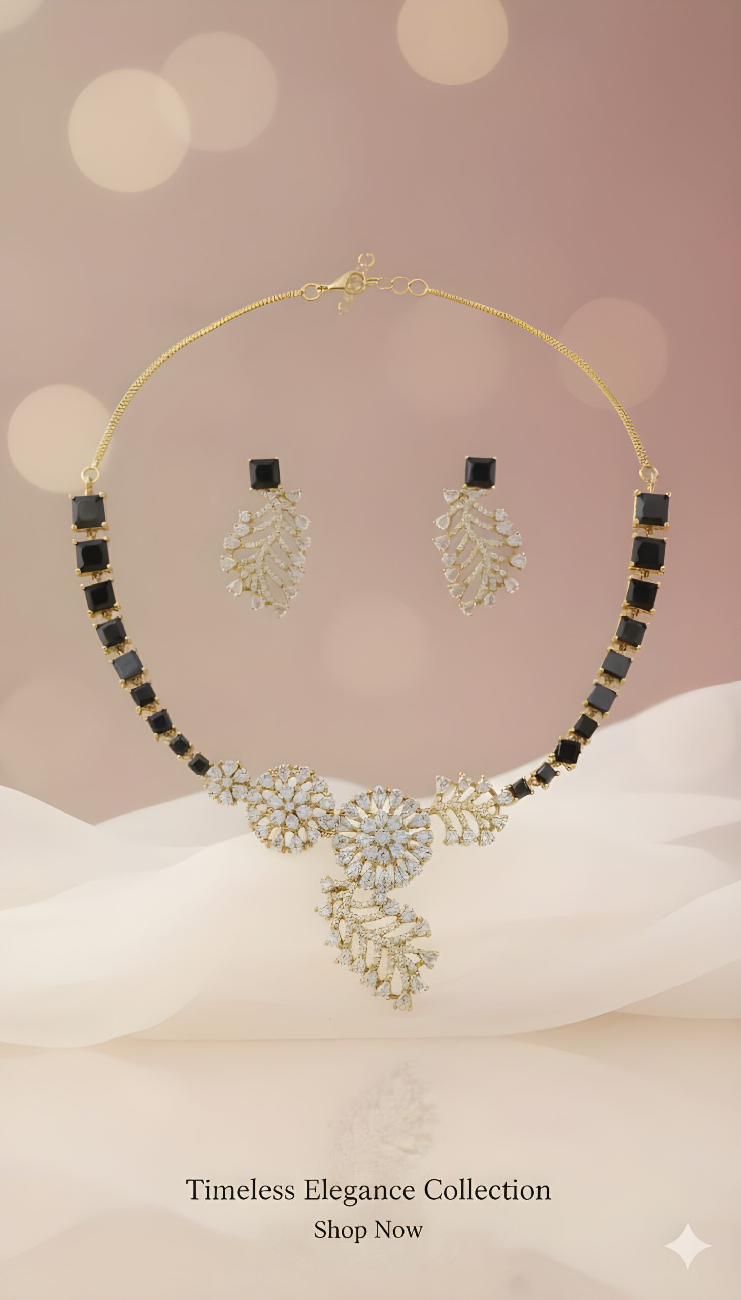 - High-Grade Stones: Adorned with numerous AAA-grade American Diamonds (ADs) in various cuts (round, marquise), and prominent rectangular deep black crystals (simulated onyx/spinel).