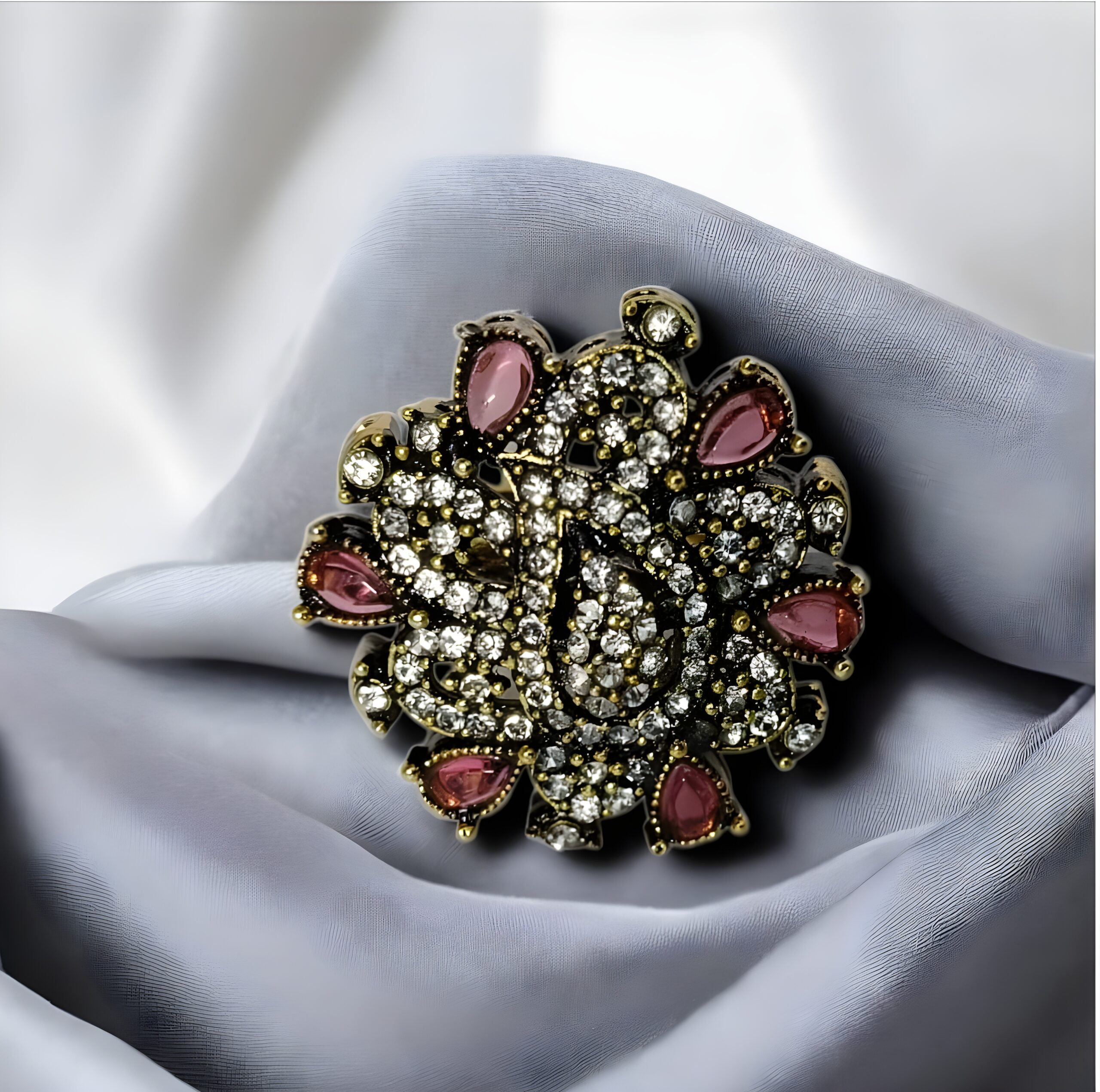 • Precision Setting: The stones are set securely in multiple layers, utilizing intricate metalwork to create the multi-dimensional floral effect.