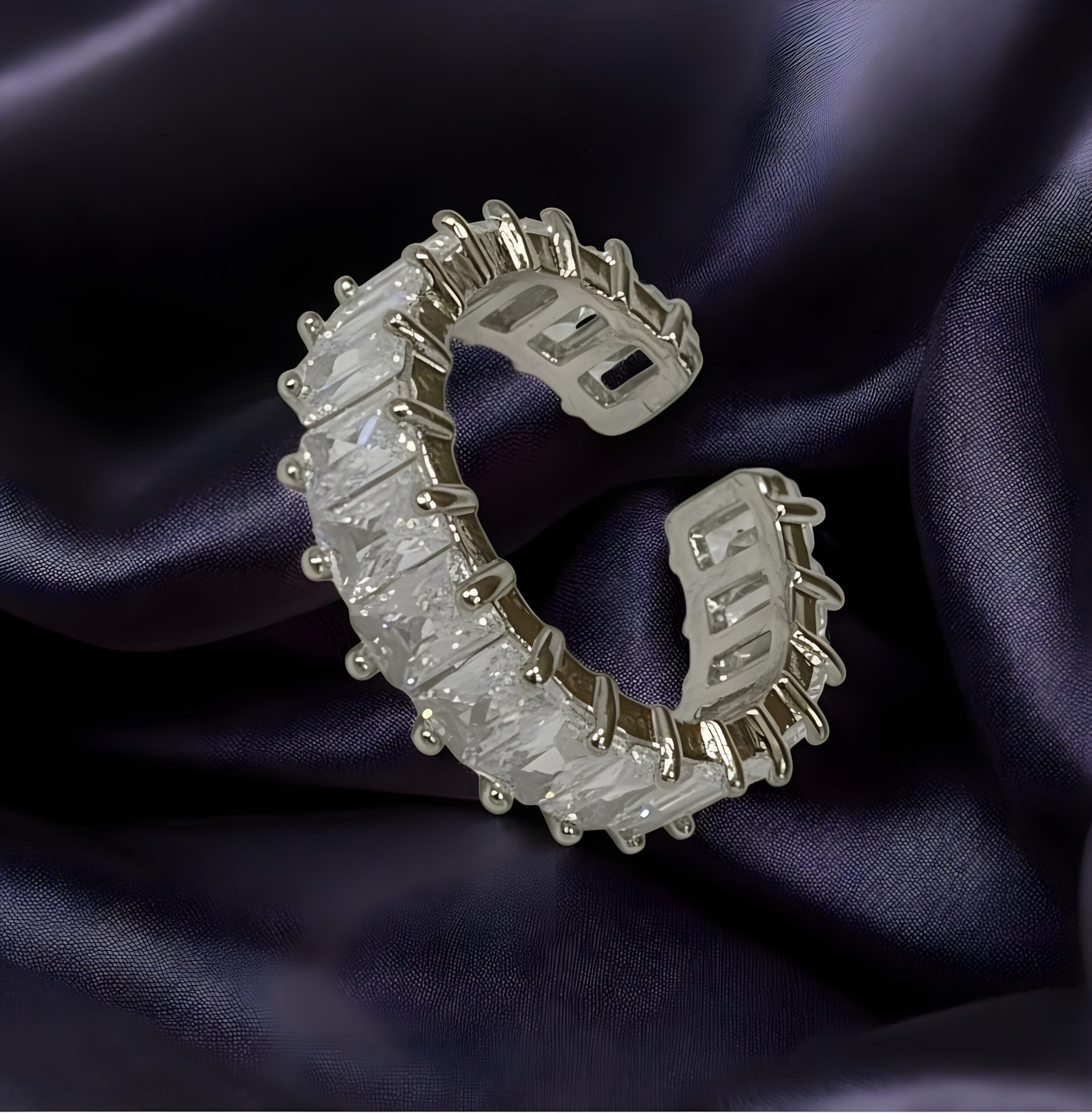 Illuminate your hand with the “Radiant Eternity Adjustable Ring,” an exclusive and magnificent piece from Kazaara. This show-stopping adjustable finger ring features a bold, open-cuff design completely lined with continuous, horizontally set baguette-cut American Diamond (AD) stones. The dazzling clear stones are held securely by classic prong settings, maximizing their fire and brilliance. Crafted on a durable brass base metal and finished in a lustrous silver tone, this ring offers the ultimate diamond look. Its flexible design ensures a comfortable, customized fit, making it a powerful and versatile accessory for any occasion.