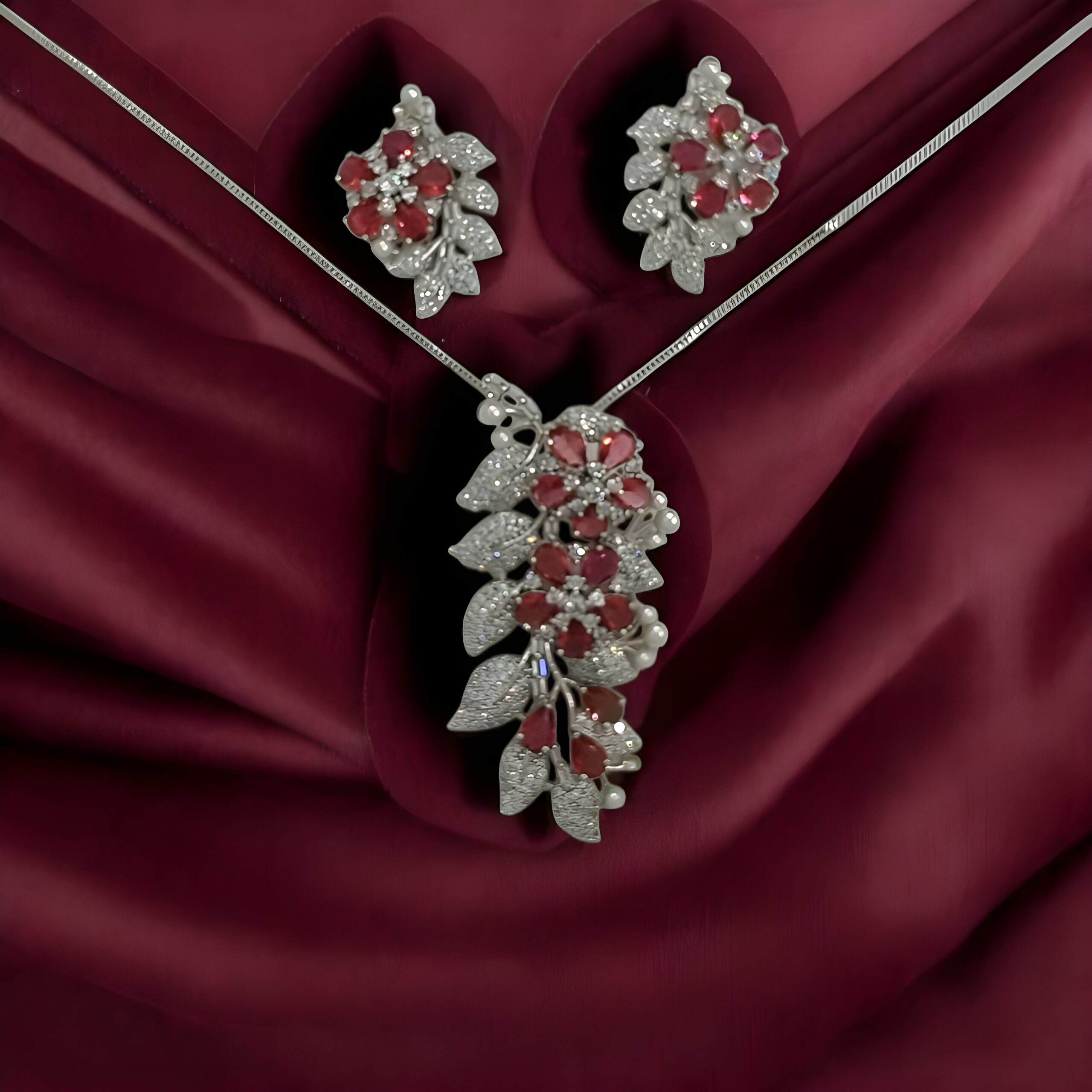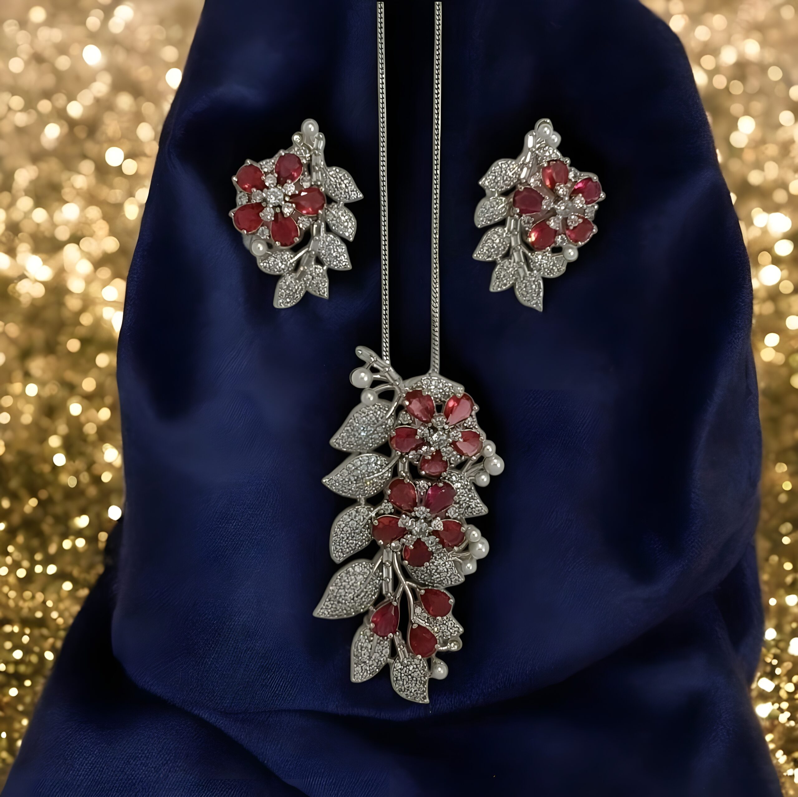 • Floral Brilliance Pendant and earrings feature a blooming flower motif with red center stones—symbolizing joy, beauty, and grace.