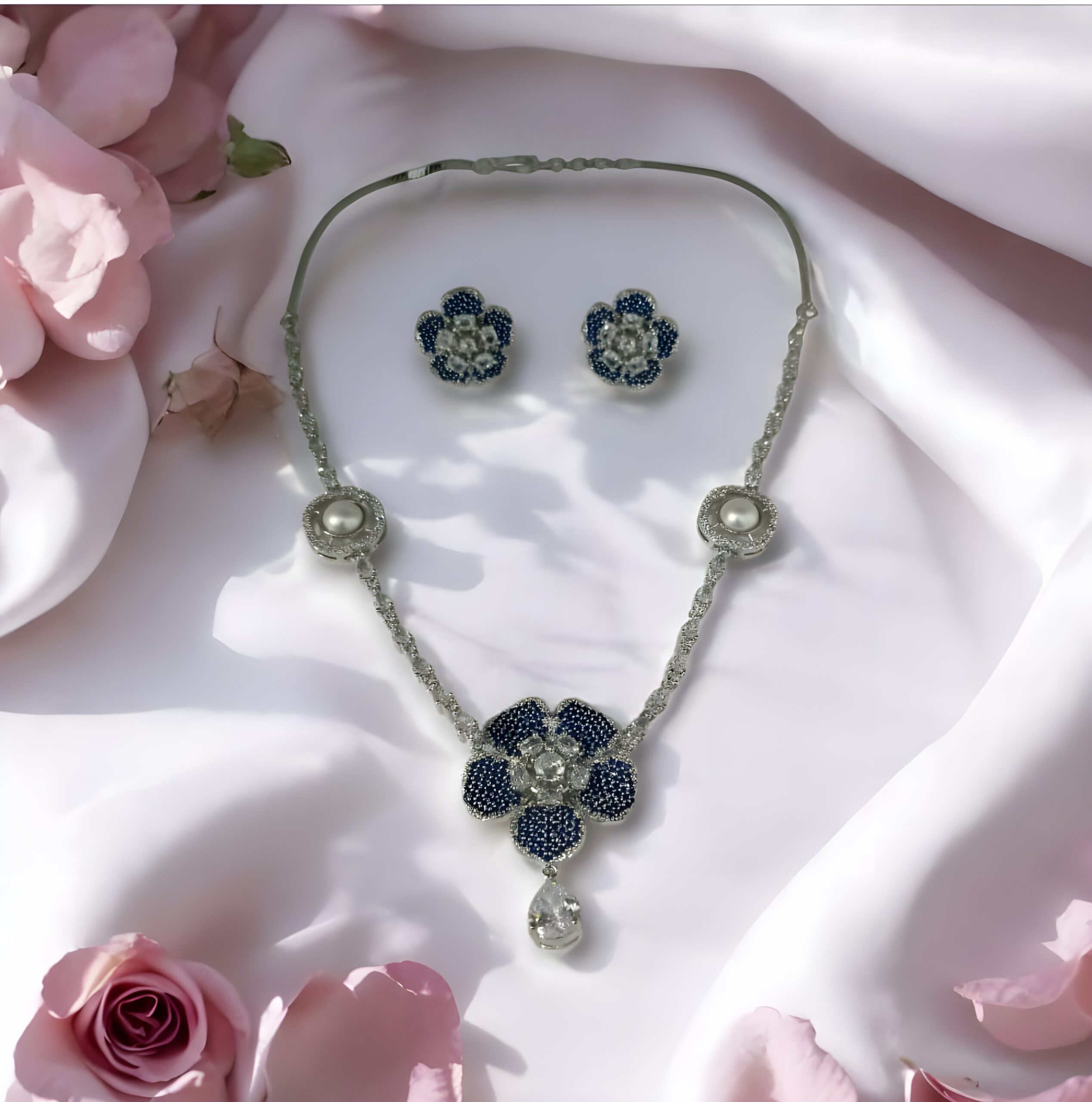 Experience the elegance of twilight with our Sapphire Bloom AD Necklace Set, an exclusive piece featuring striking color contrast. The necklace showcases a magnificent floral centerpiece paved with deep sapphire-hued and brilliant clear American Diamonds (AD), finished with a dazzling teardrop dangle. The chain features charming intermediate floral motifs, each exquisitely framed by AD stones surrounding a central faux pearl. Completed by matching cluster earrings, this set is finished in a radiant rhodium polish, making it the perfect statement for evening galas, formal dinners, or wedding receptions.