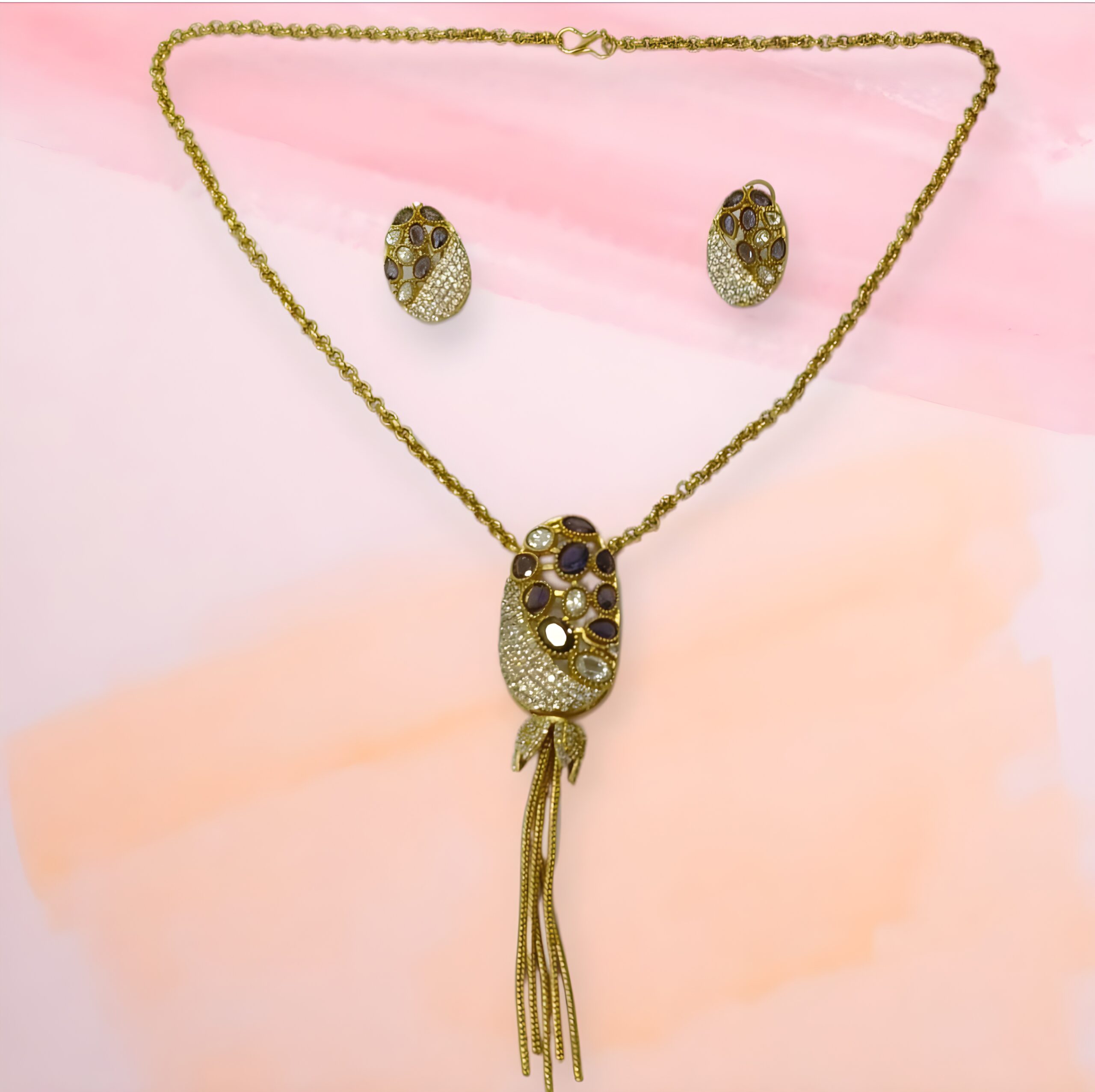 • Unique Multi-Stone Mosaic: The oval pendant and matching earrings feature a captivating mosaic of deep reddish-purple and clear/white oval and round stones, creating a rich visual texture and intriguing color contrast.