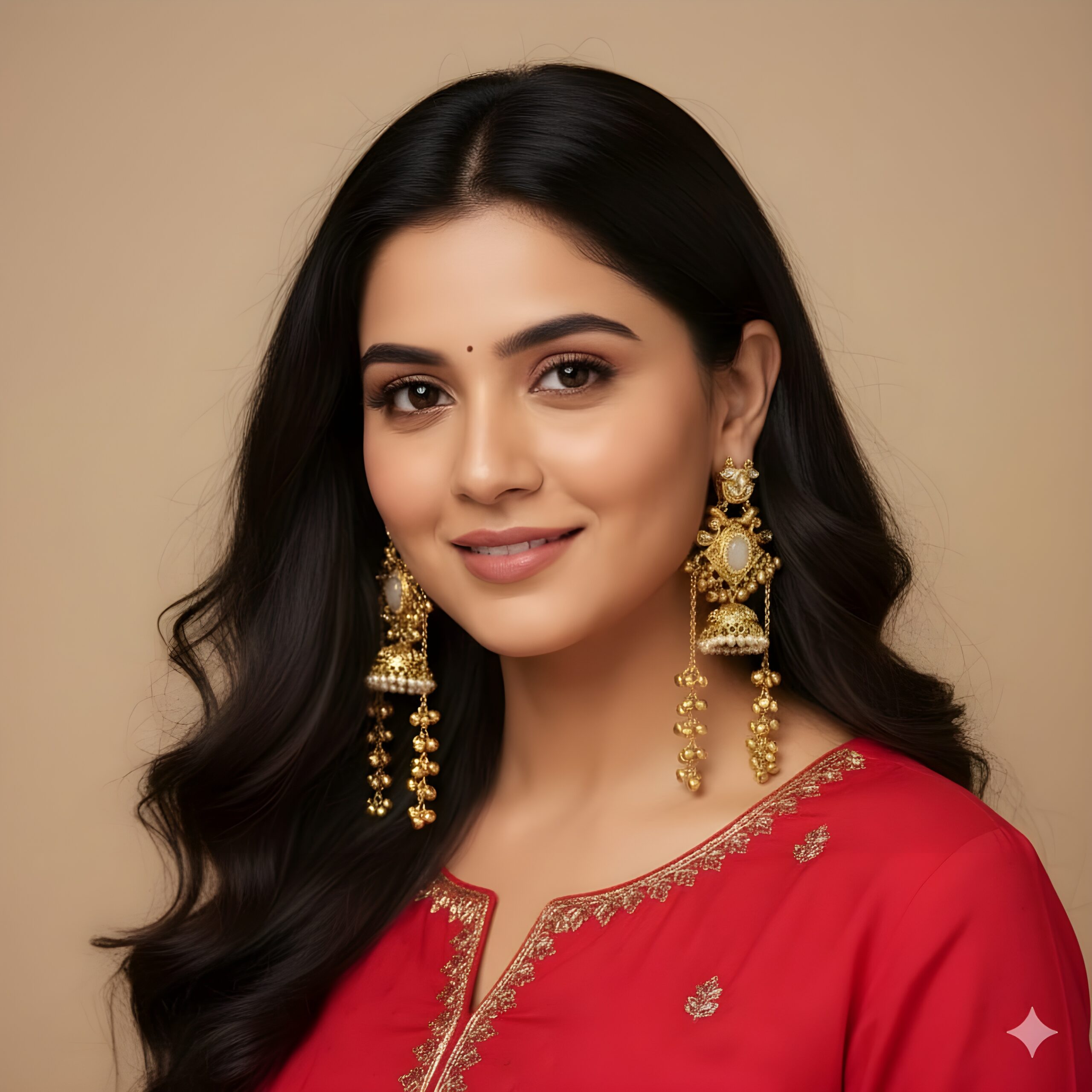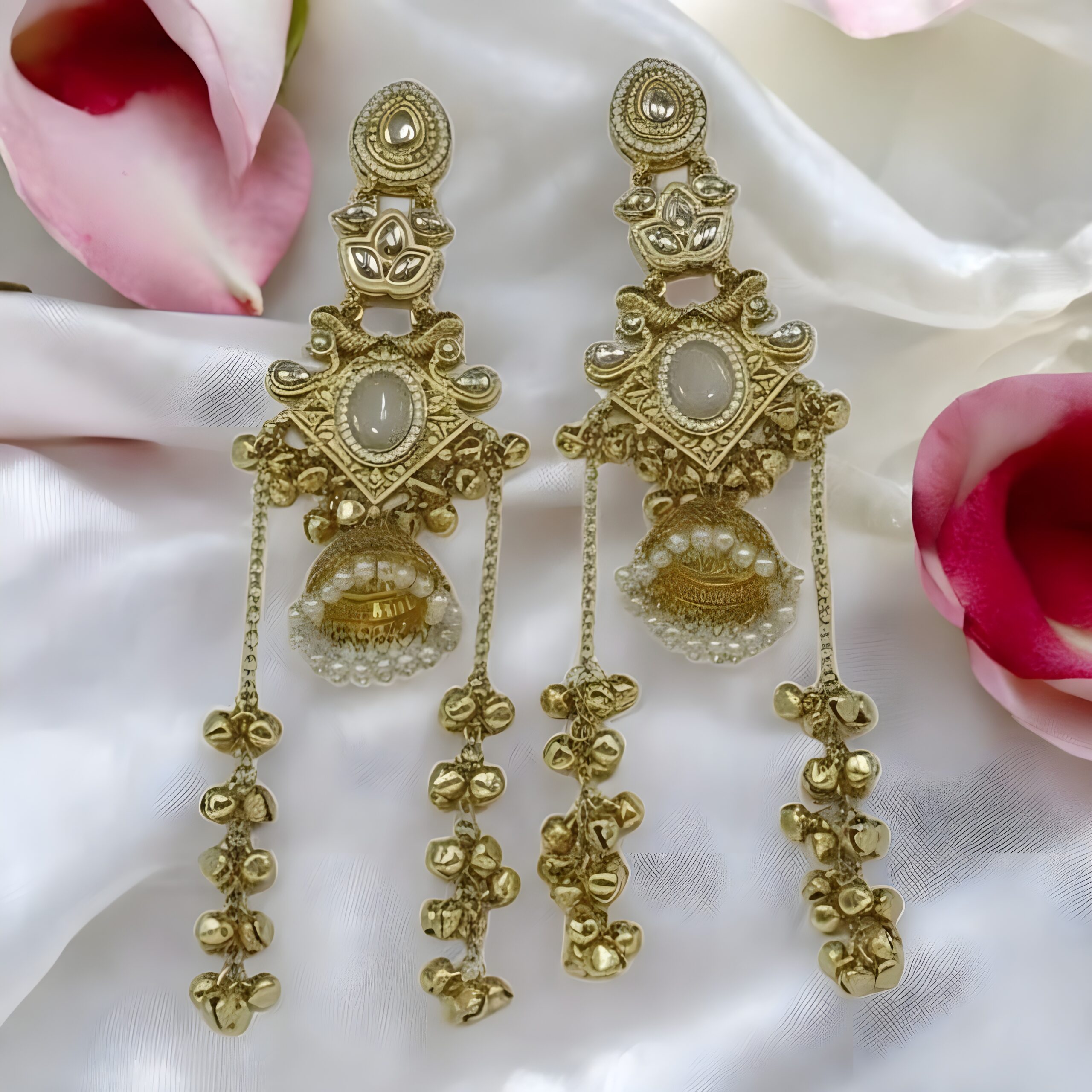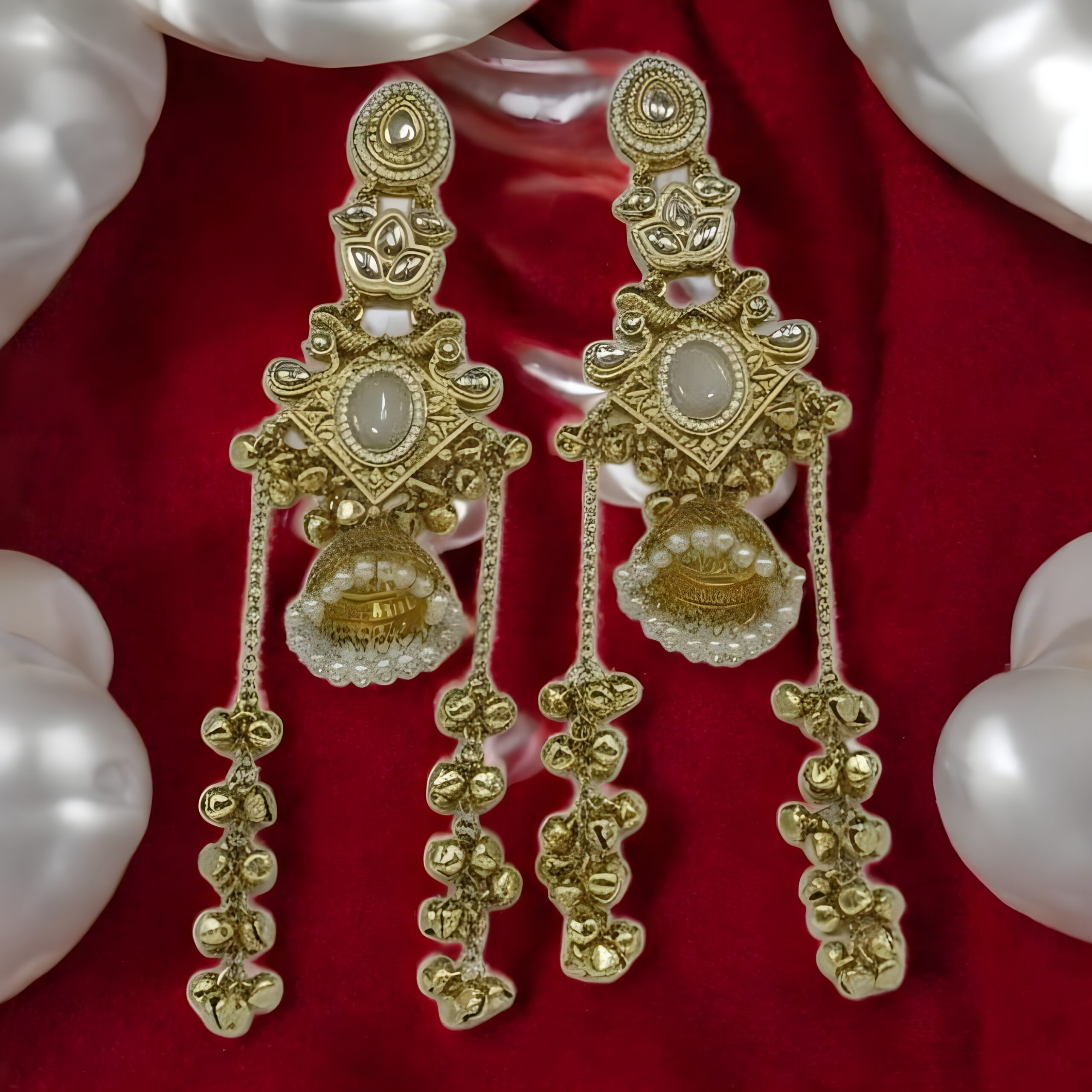• Flowing Chain Tassels: Long, elegant chains dangle from the jhumka bells, adorned with gold-tone bead clusters, adding to the dramatic and classic aesthetic.