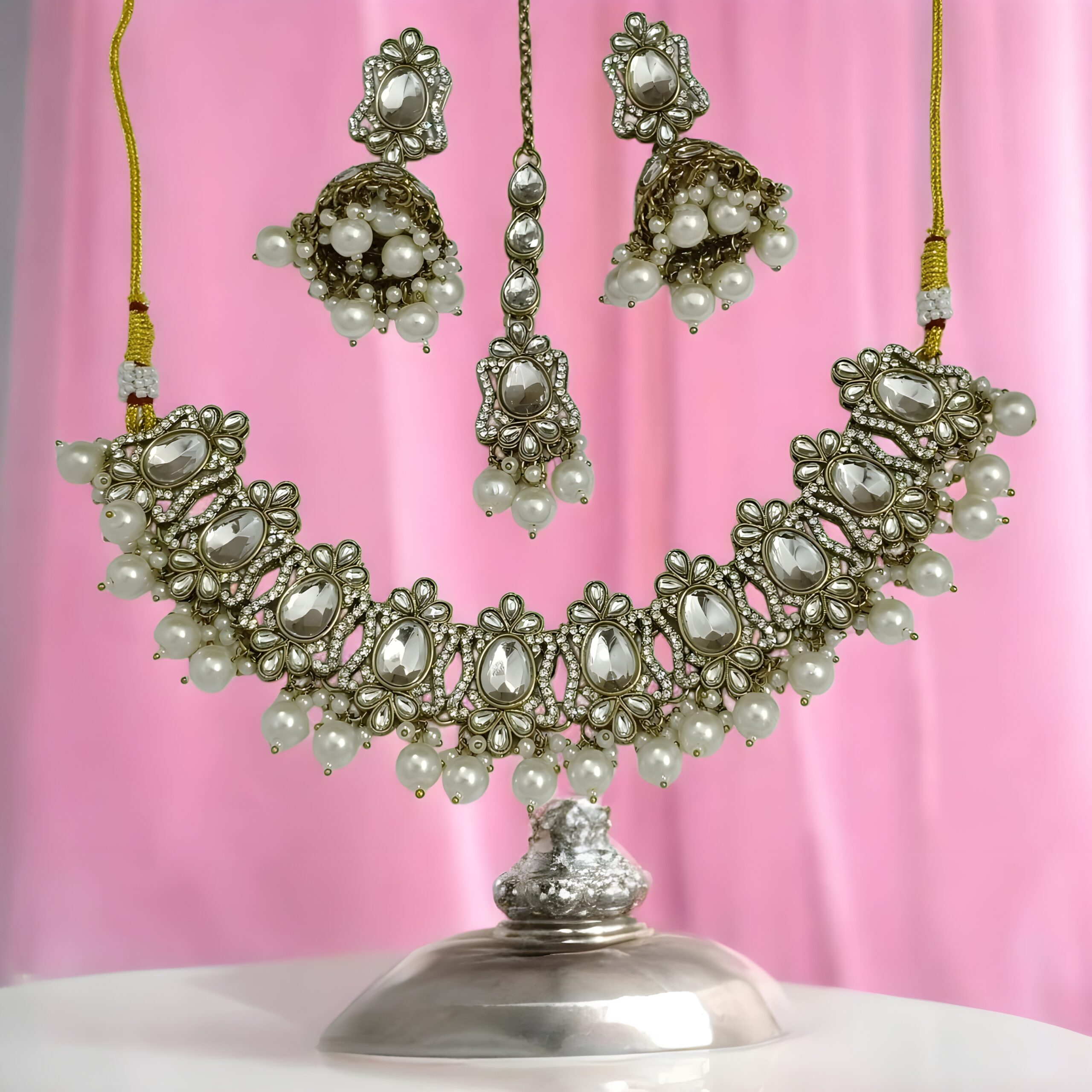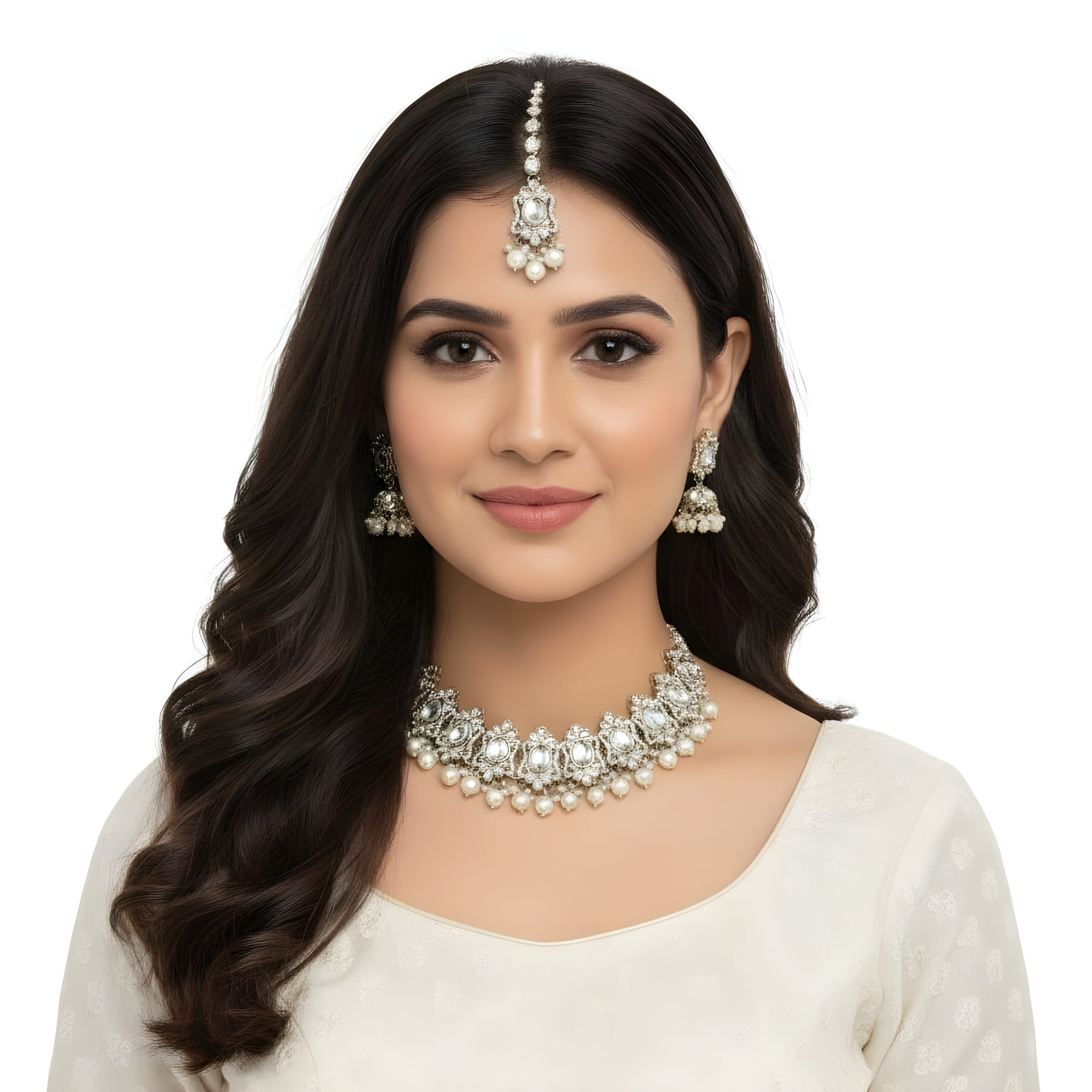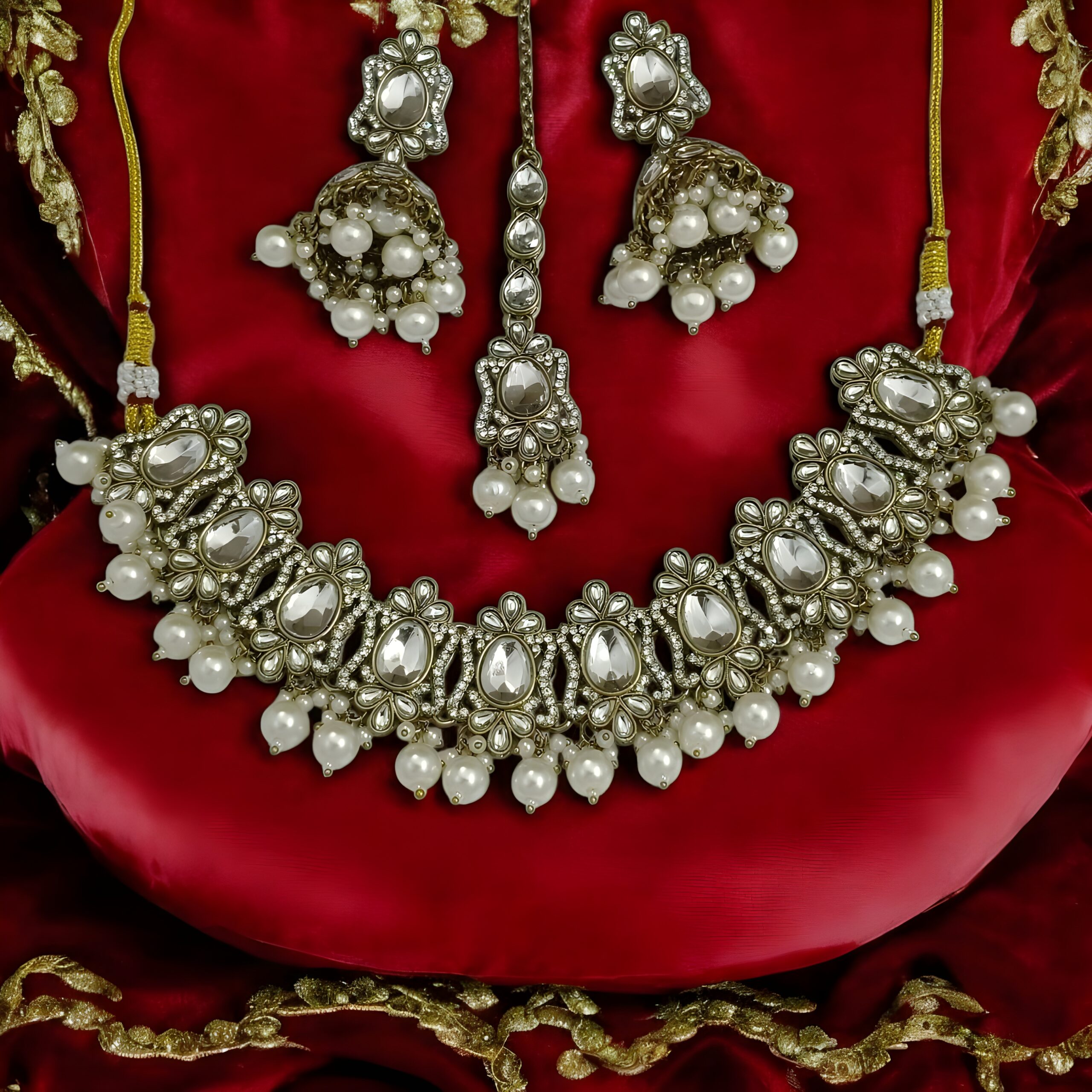 - Plating: Sophisticated Antique Gold-Tone Plating, providing a rich, textured, and enduring finish that perfectly complements the clear Kundan-style stones and lustrous pearls.