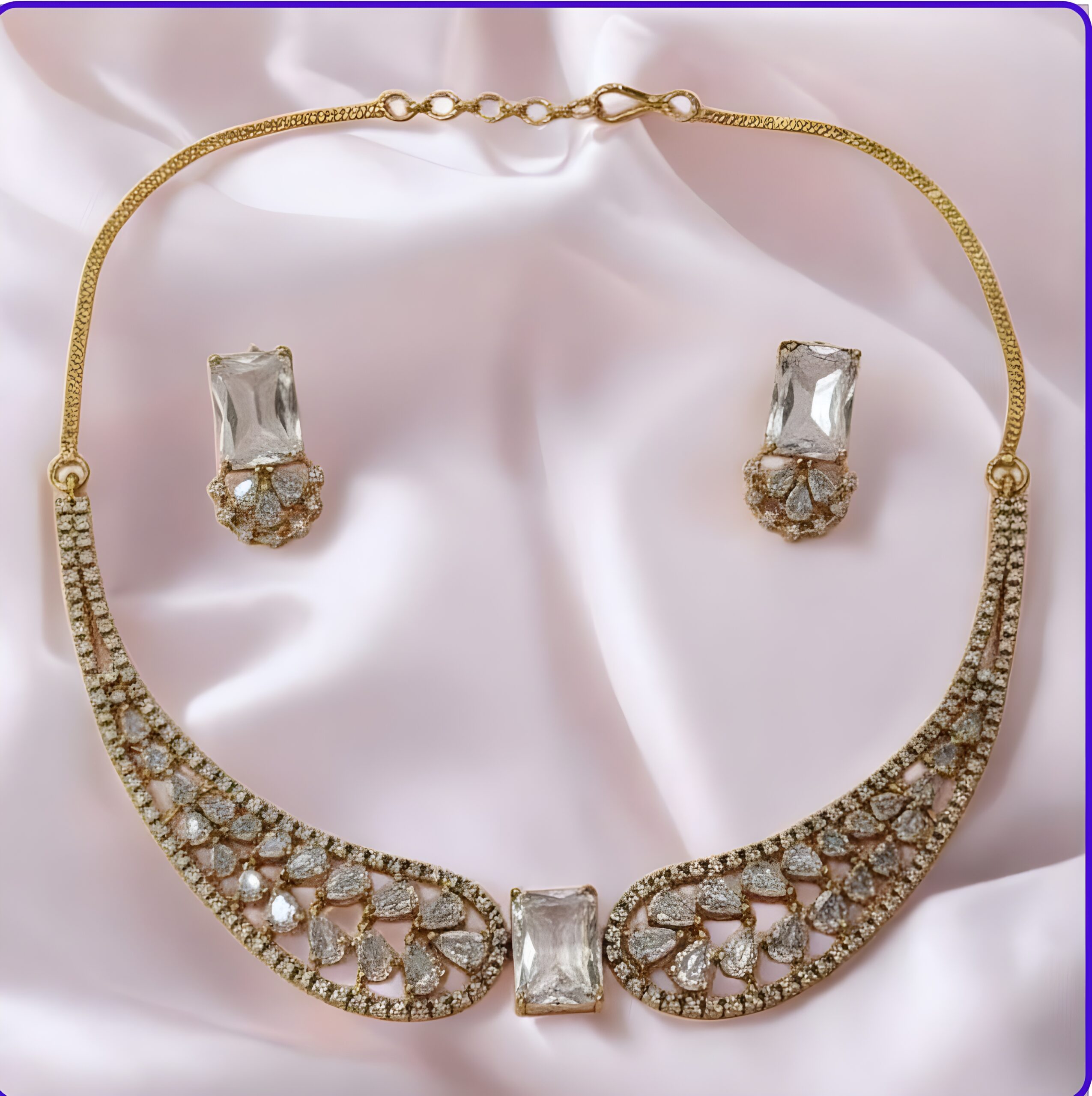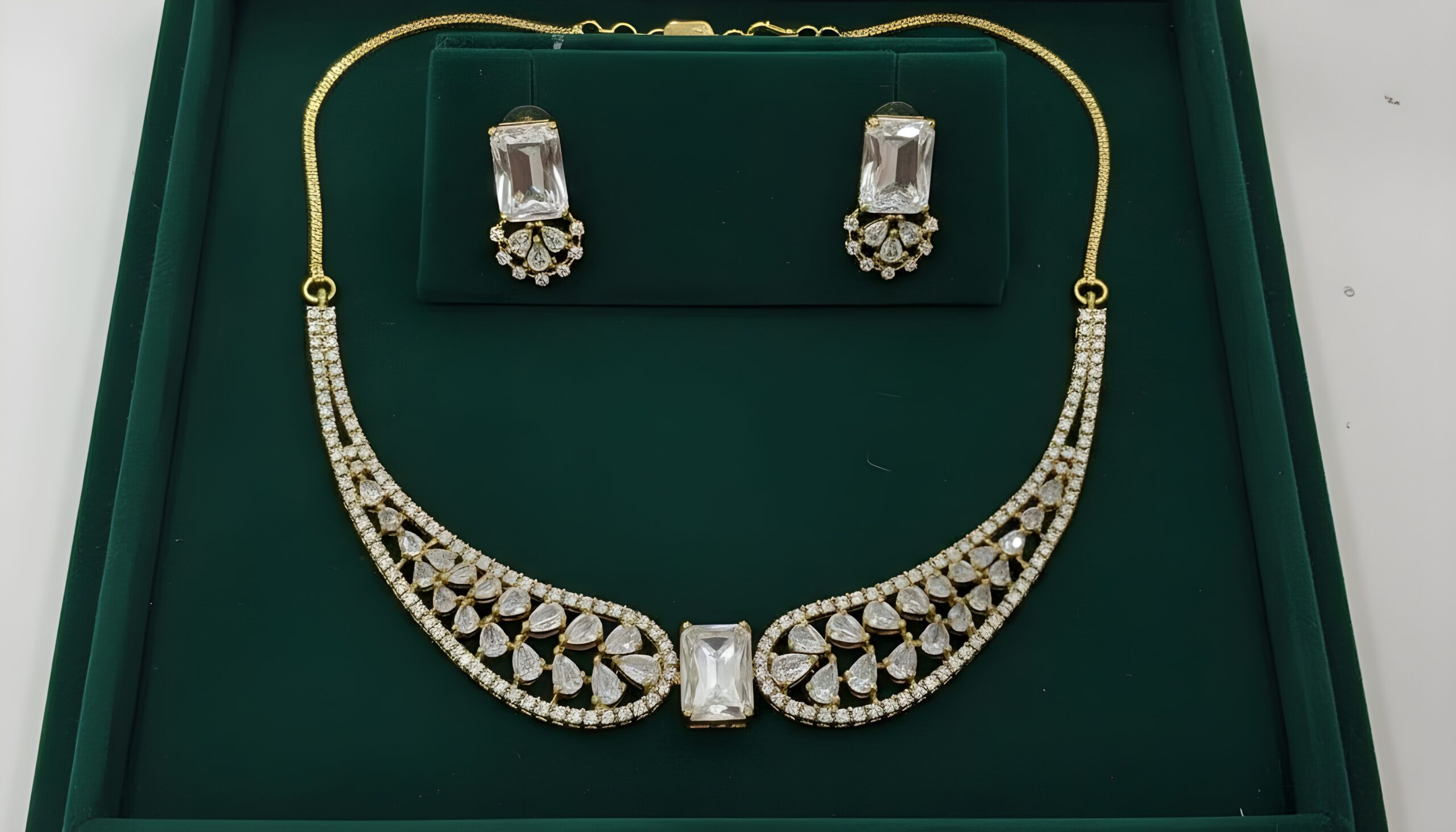 - Stones: Top-quality American Diamonds (AD), also known as cubic zirconia (CZ), meticulously cut and polished for maximum fire, brilliance, and clarity, closely mimicking natural diamonds. The set features a mix of rectangular, pear, and round cuts.