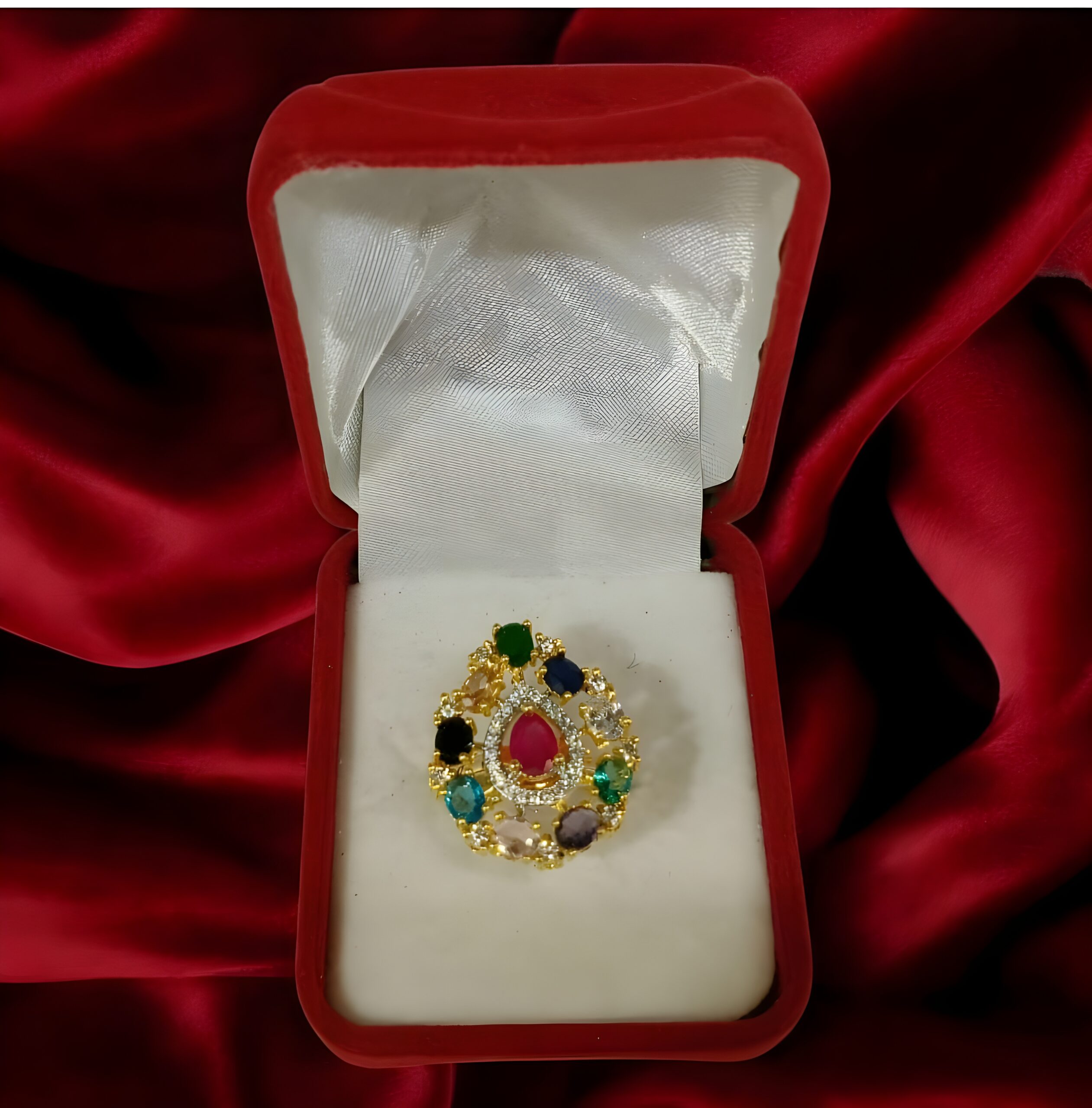 Traditional Navratan Display: Features the auspicious arrangement of nine distinct colored stones (Navratna) encircling the central cluster, each one adding a pop of vibrant color.