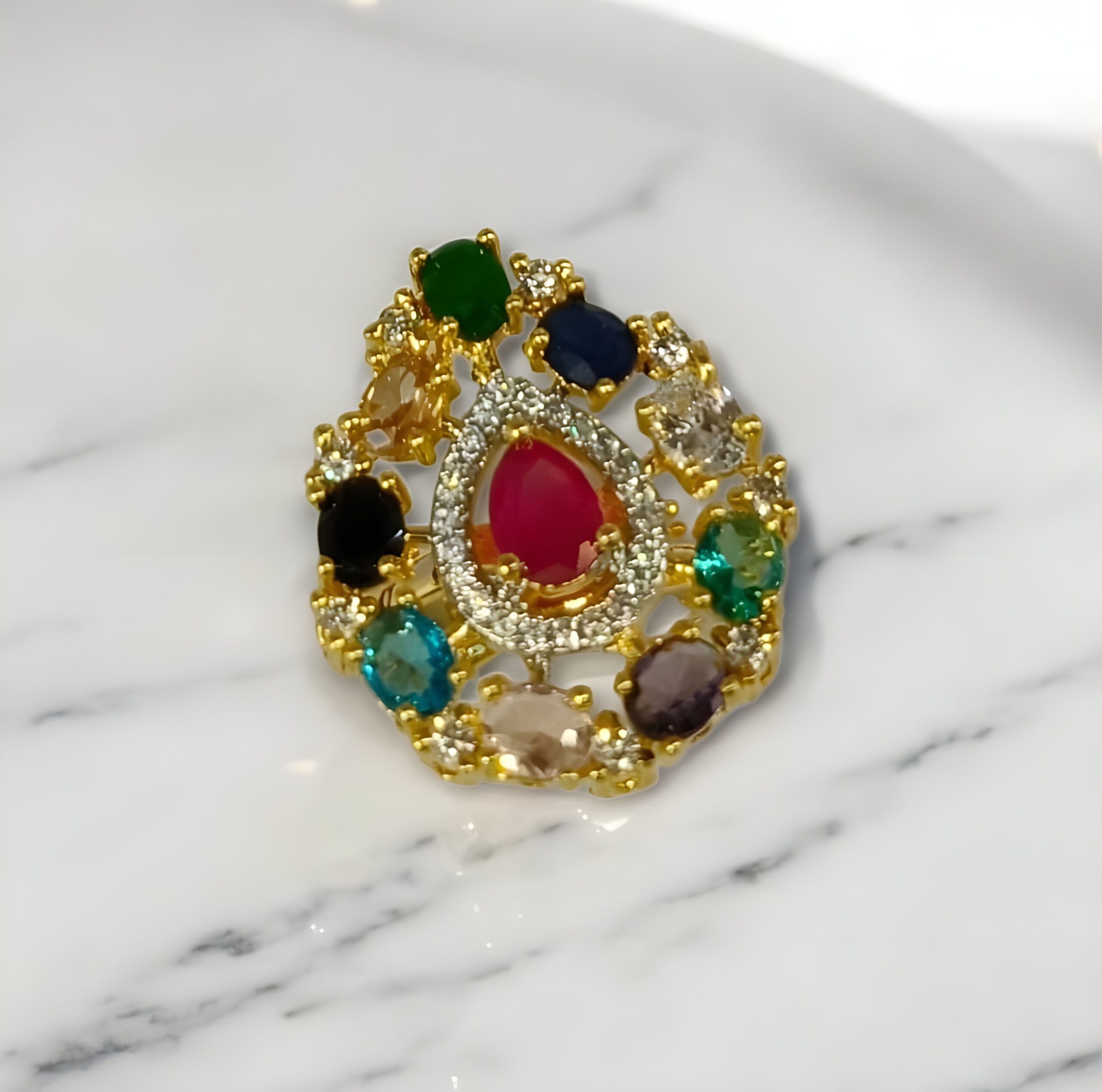 This stunning statement ring offers a modern take on the traditional Navratan jewelry concept, featuring an elegant teardrop (or pear-shaped) cluster. Crafted with a durable brass base and a brilliant gold-plated finish, its distinctive shape beautifully frames a central faceted ruby-red pear-cut stone. The red stone is encircled by a glittering clear halo, which is, in turn, surrounded by the nine auspicious colored gems. The adjustable band ensures a comfortable and flexible fit for all, creating a piece that is both deeply traditional and refreshingly contemporary.