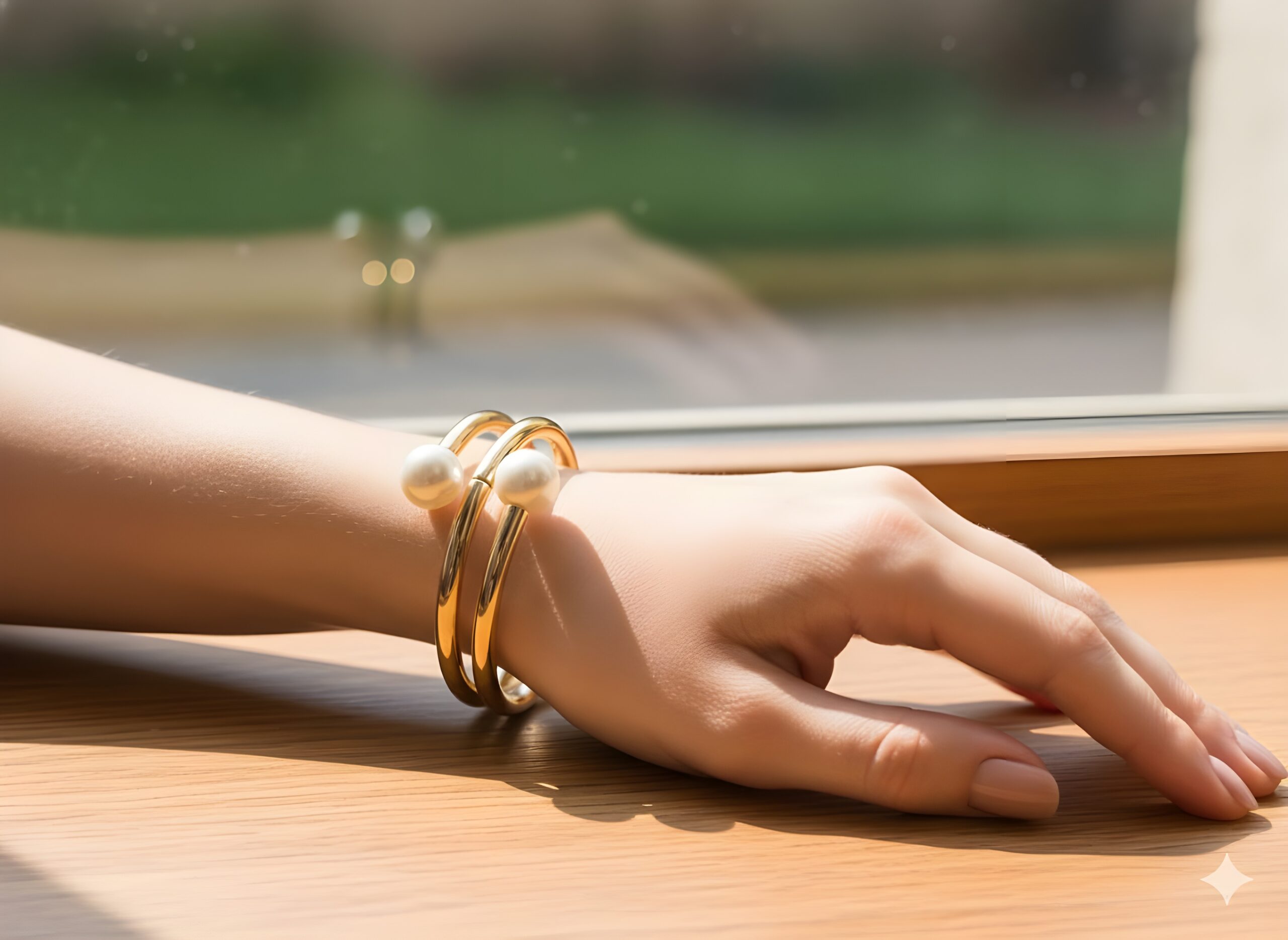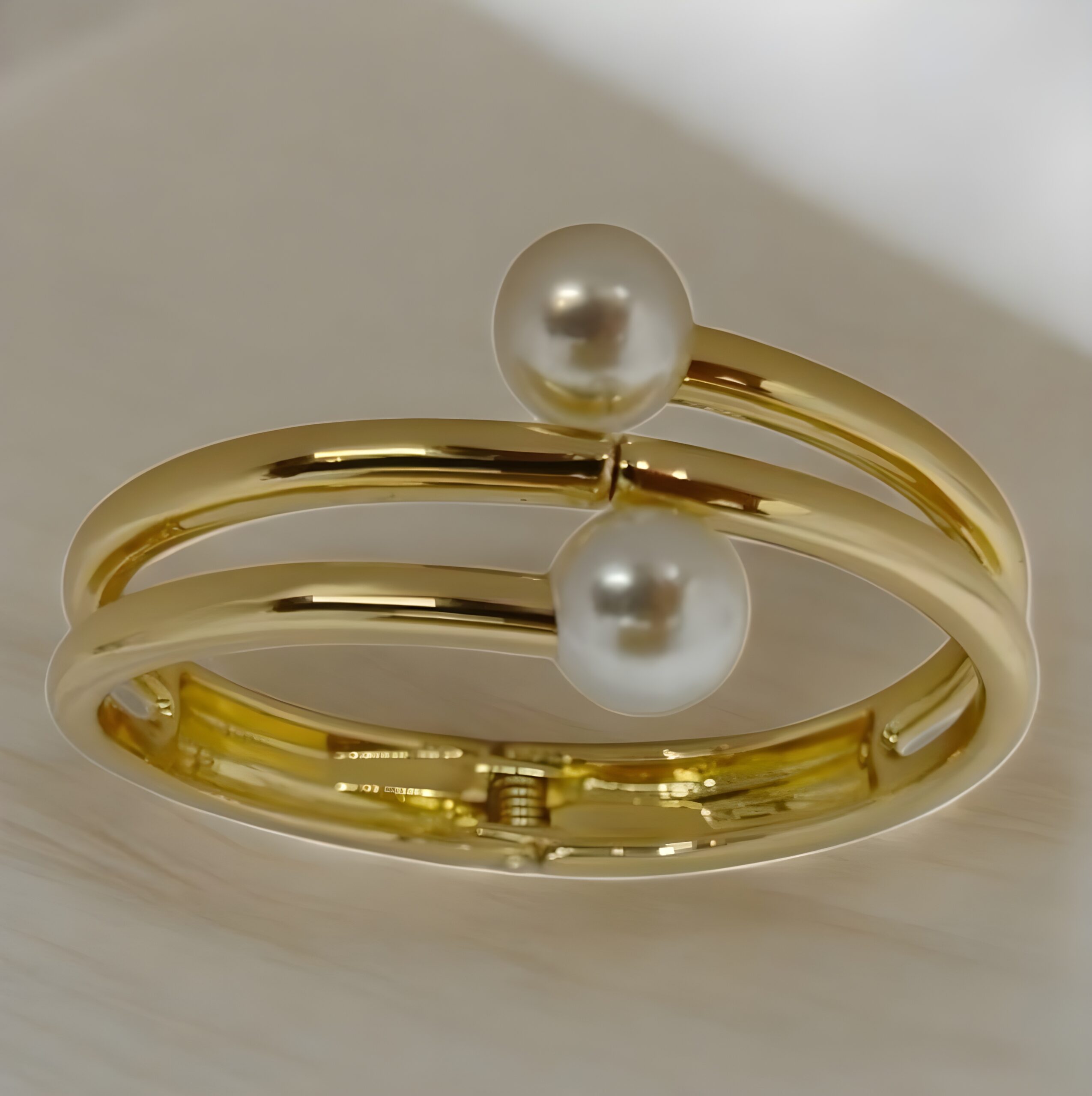 Experience the meticulous artistry and premium components that define the Twin Pearl Bangle Bracelet: